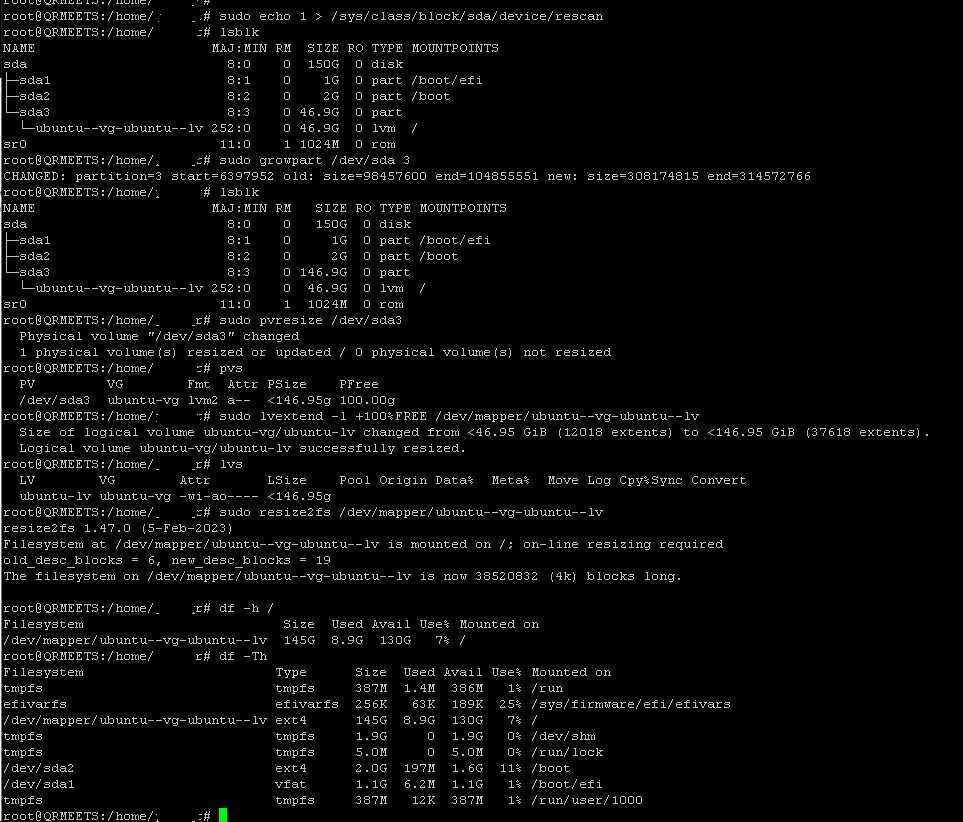 /dev/mapper/ubuntu--vg-ubuntu--lv 145G 8.9G 130G /